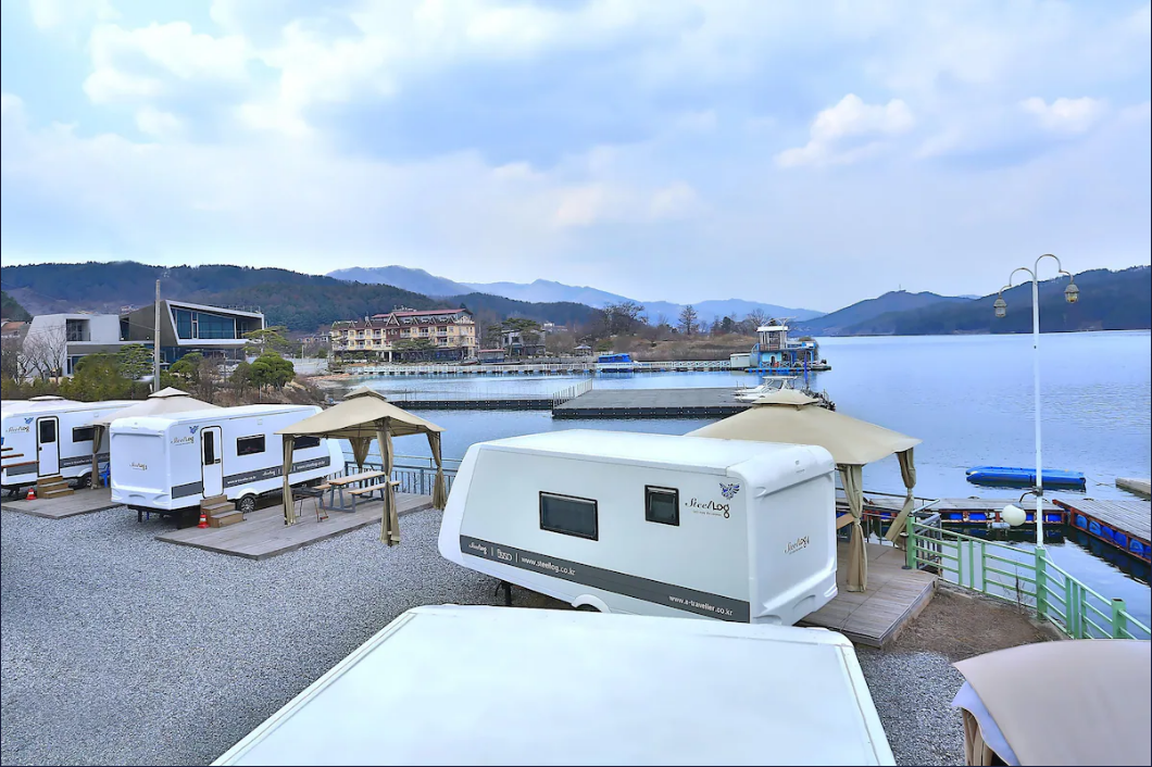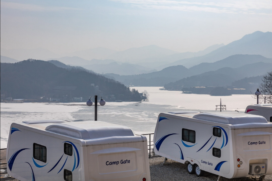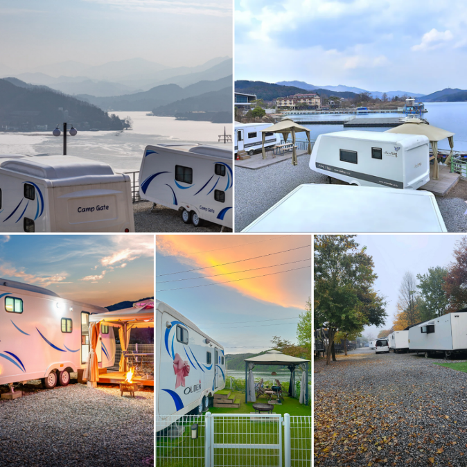 - 특징: 캠프게이트는 청평호가 내려다보이는 멋진 호수 뷰를 자랑합니다. 각 카라반은 개별 주방과 화장실을 갖추고 있으며, 청결한 시설과 넓은 바비큐 공간이 준비되어 있습니다. 여름에는 수영장과 함께 즐길 수 있고, 겨울철에도 따뜻한 난방이 가능해 편안한 캠핑을 제공합니다. 쁘띠프랑스와 인접해 있어 주변 관광지도 쉽게 즐길 수 있습니다.