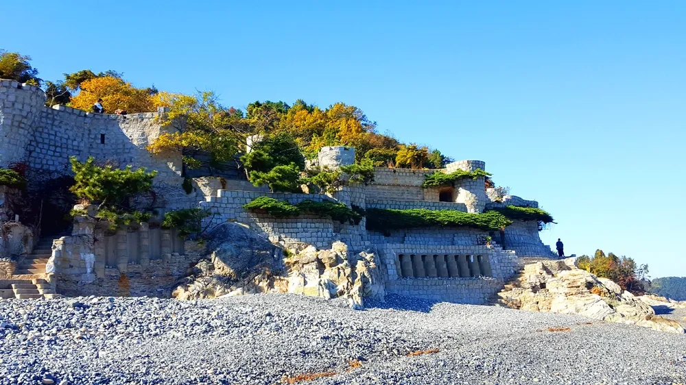 위치는 거제시 장목면 대금리 해변가, 바닷가 바로 옆에 지어진 독특한 중세풍 성곽이 눈길을 사로잡습니다.
