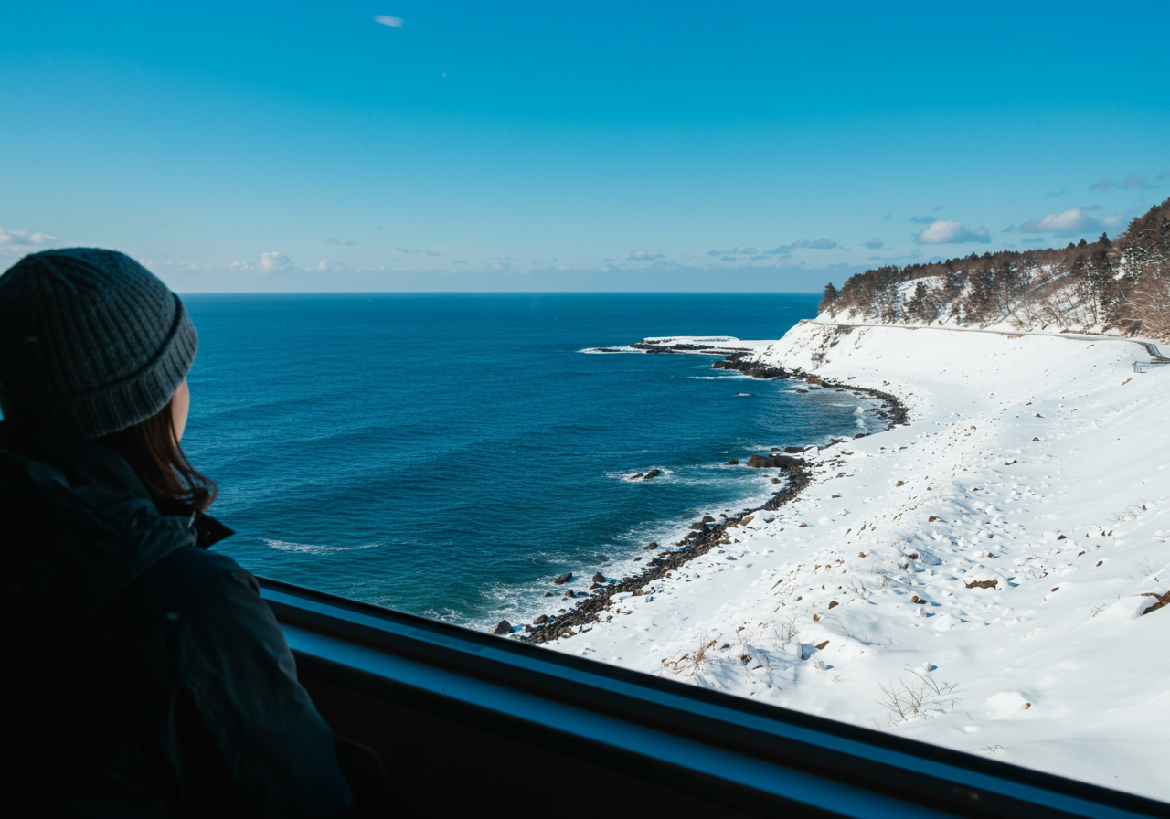 '삿포로 오타루 기차' 여행의 하이라이트라고 할 수 있는 이 구간은, 창밖으로 펼쳐지는 겨울 바다의 풍경이 압권입니다. 바다와 맞닿은 철로를 달리는 기차는 마치 바다 위를 질주하는 듯한 환상적인 느낌을 선사하죠.