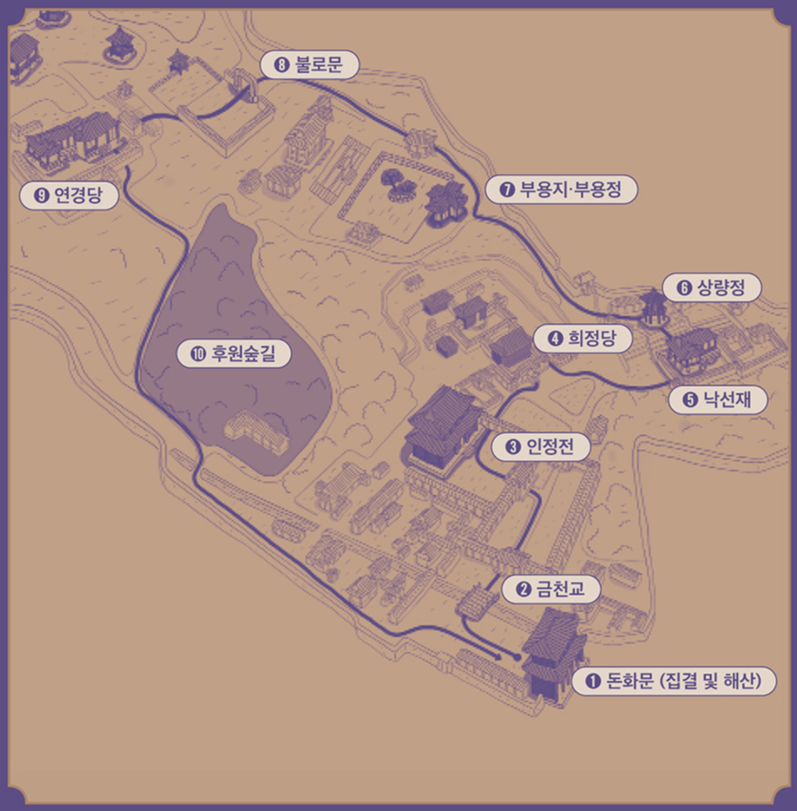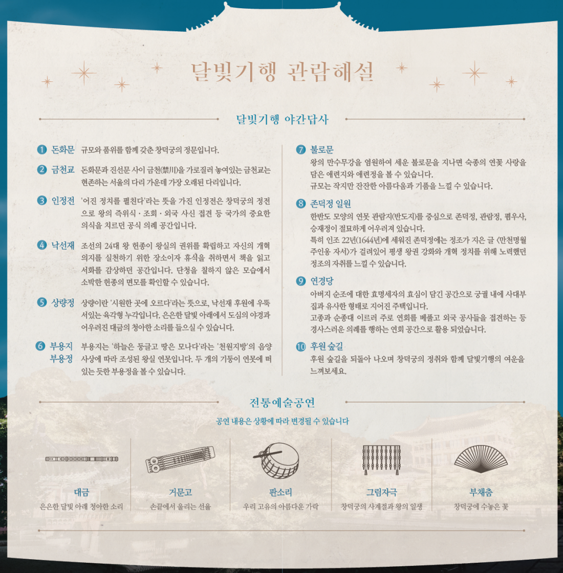 ① 돈화문(집결, 해산) → ② 금천교 → ③ 인정전 → ④ 낙선재 → ⑤ 상량정(대금연주) → ⑥ 부용지·부용정 → ⑦ 불로문 → ⑧ 존덕정 일원(판소리) → ⑨ 연경당(전통예술공연) → ⑩ 후원숲길