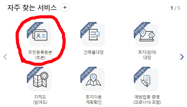1. 정부24에 접속하여 주민등록등본 초본 메뉴를 클릭합니다.