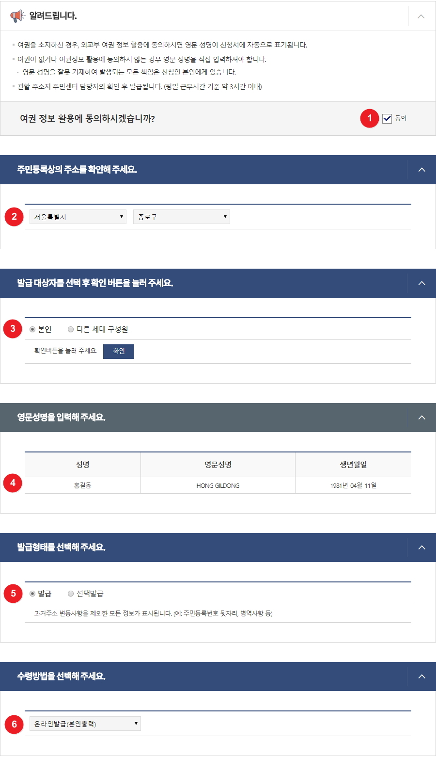 ① 여권을 소지한 세대구성원의 영문이름을 자동 표기 하려면 동의 옆 체크