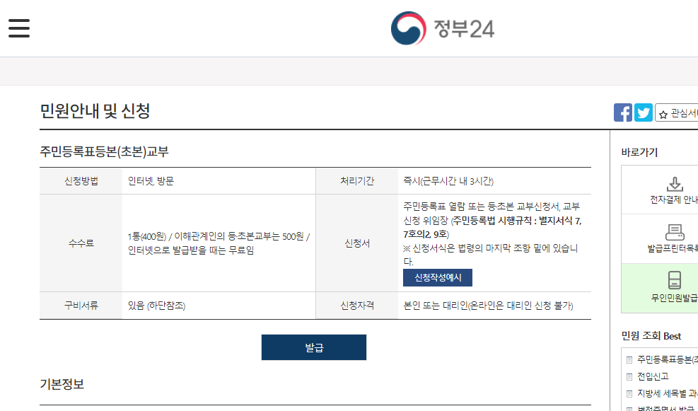 주민등록등본 초본 발급수수료