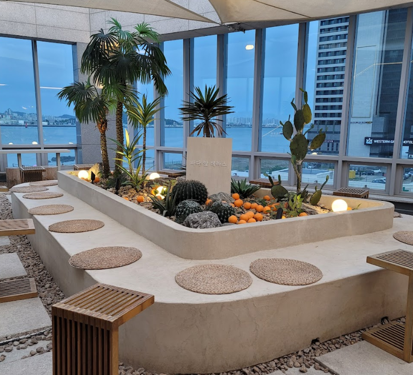 바다와 공원을 함께 볼 수 있는 아름다운 카페 주소: 인천광역시 중구 영종 광장로 39 오션테라스 진 영업시간: 오후 9:00에 영업 종료 연락처: 032-751-0079
