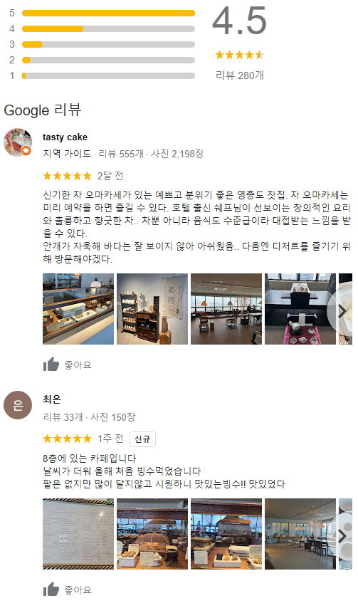 바다와 공원을 함께 볼 수 있는 아름다운 카페 주소: 인천광역시 중구 영종 광장로 39 오션테라스 진 영업시간: 오후 9:00에 영업 종료 연락처: 032-751-0079
