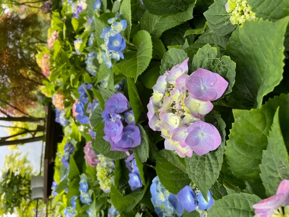 꽃다발 같은 '큰잎 수국', 원뿔 모양의 흰 꽃이 만개한 '목수국', 큰 다발이 달린 '아메리카 수국', 단순하고 청순한 푸른 빛깔의 '산수국' 등 촘촘한 꽃들이 모여 자신만의 아름다움을 겨룹니다. 화담숲공원에는 수국공동체가 푸른 비단길처럼 자태를 뽐내는 수국정원 등 다양한 포토존이 조성돼 있어 여름여행의 삶을 사진으로 담기에 안성맞춤입니다.