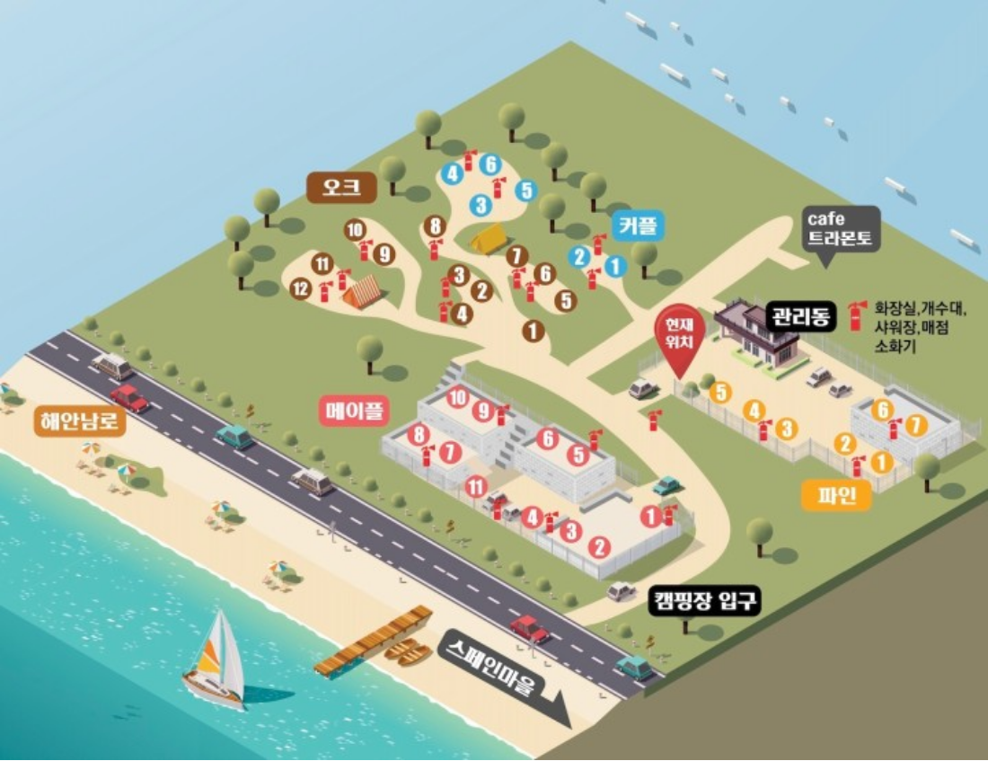 시설 : 바다낚시, 수영장, 물놀이, 매점, 수세식 화장실, 온라인예약, 와이파이, 장작판매, 샤워시설, 개수대, 전기, 온수제공, 카라반시설, 펜션/민박