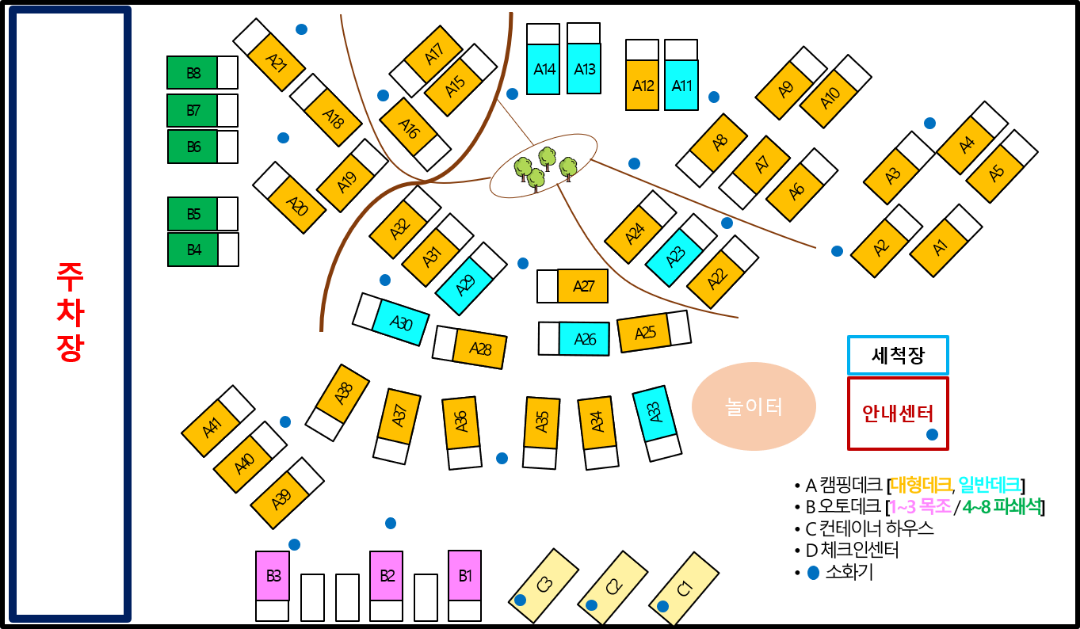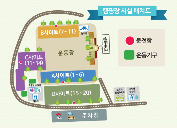 시설 : 개수대, 화장실, 샤워실, 전기, 와이파이, 장작판매, 온수, 물놀이장, 산책로, 운동시설, 캠핑장비대여,족구장